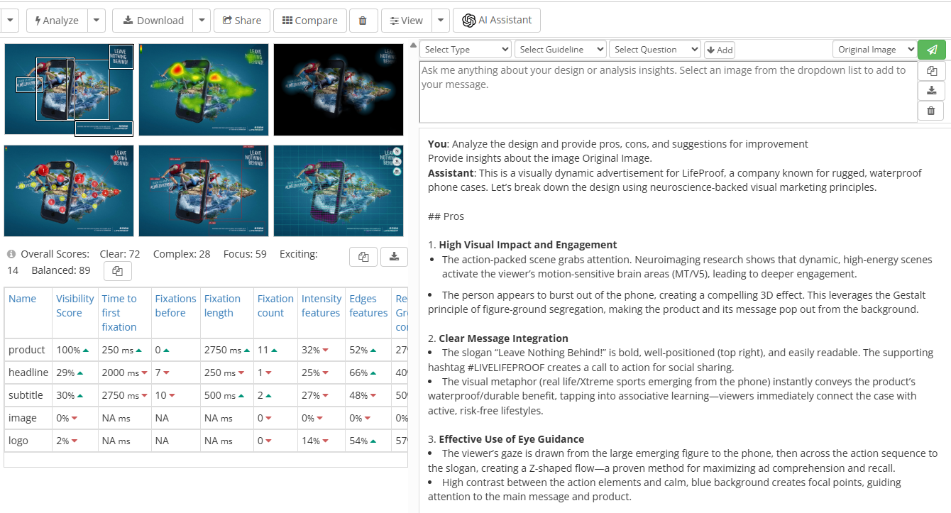 Trusted by top digital marketing and research agencies, Feng-GUI not only forecasts audience response but also enhances visual performance by analyzing attention, effectiveness, and placement to ensure maximum impact.