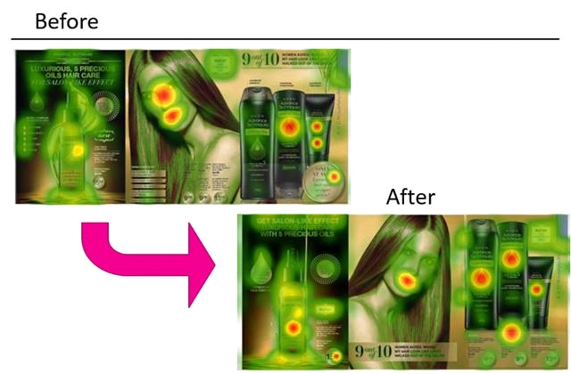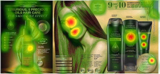 For example, AVON Central Europe used predictive eye tracking and NeuroMap to assess the final spread advertising of an oil hair care product. This the first version, before we applied the teachings from the predictive eye tracking report and the recommendations generated by a NeuroMap diagnostic.